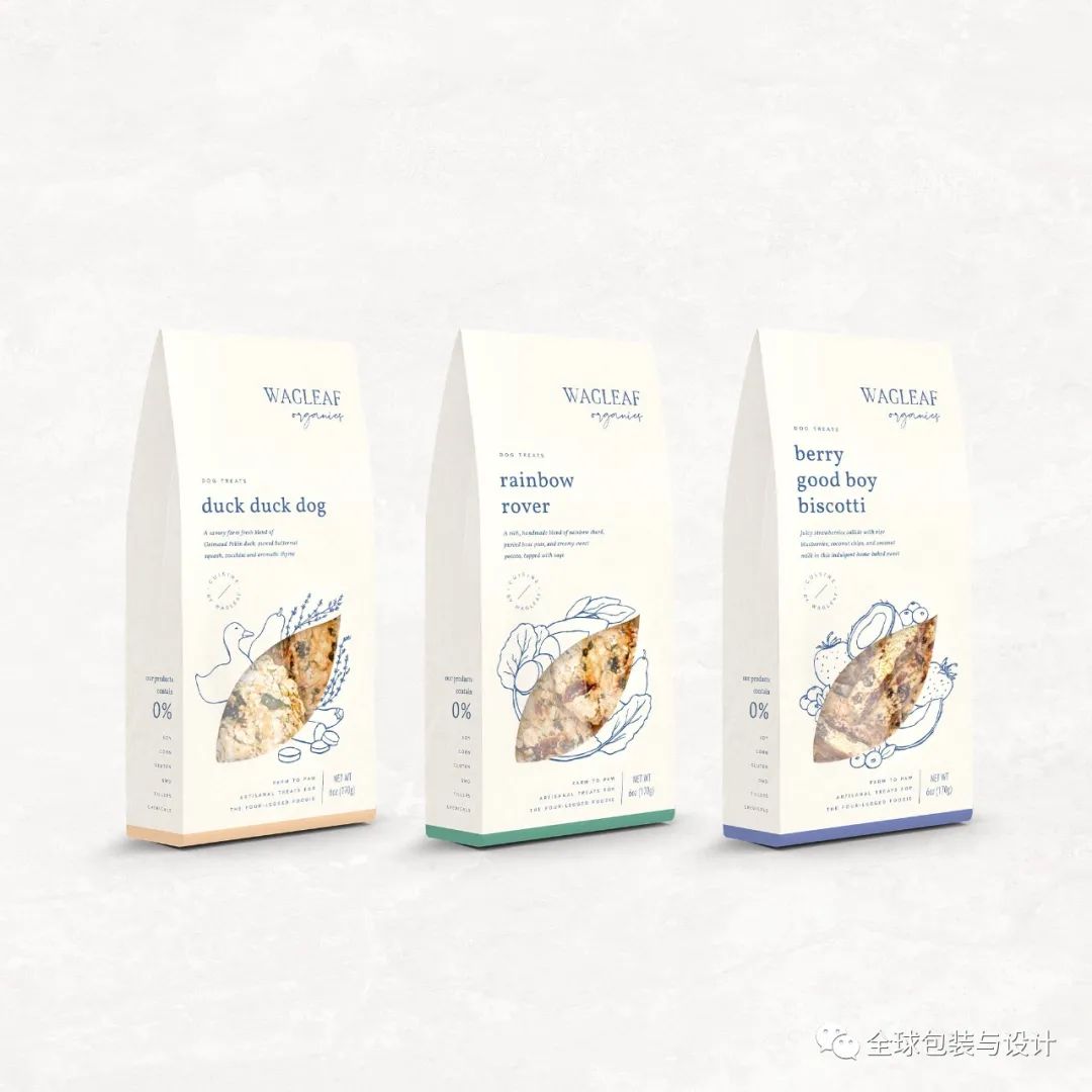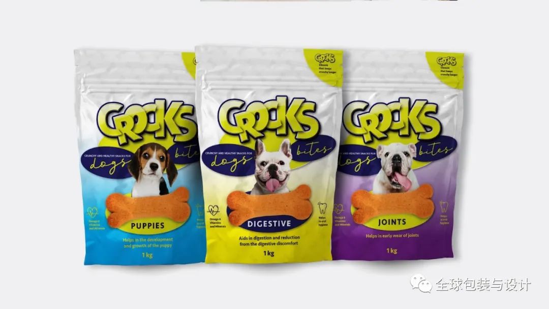 宠物产品的品牌给人温暖、友好的感觉,并赋予每个袋子上描绘的狗许多反映零食成分性质的特征。