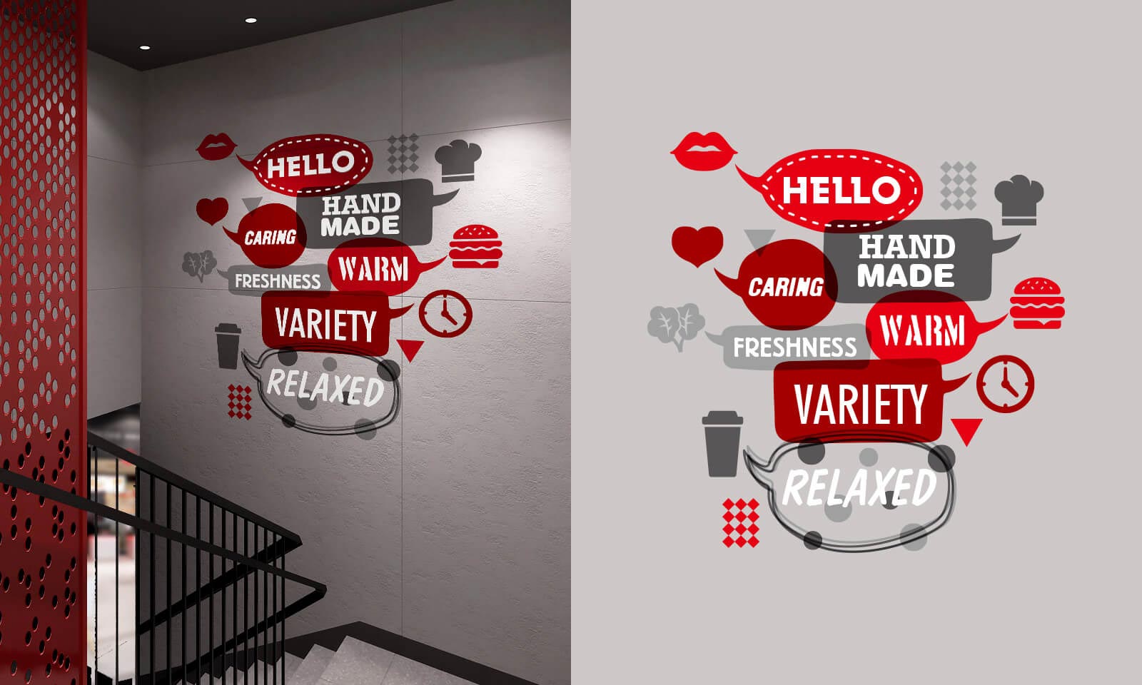 红色与灰黑色的碰撞十分具有激情与活力,墙上的壁画设计与摆放的桌椅相互呼应,大写的英文单词展示出了他们的品牌态度,设计风格时尚年轻,几个色块的搭配营造出快节奏的感觉,又不感到冲突。