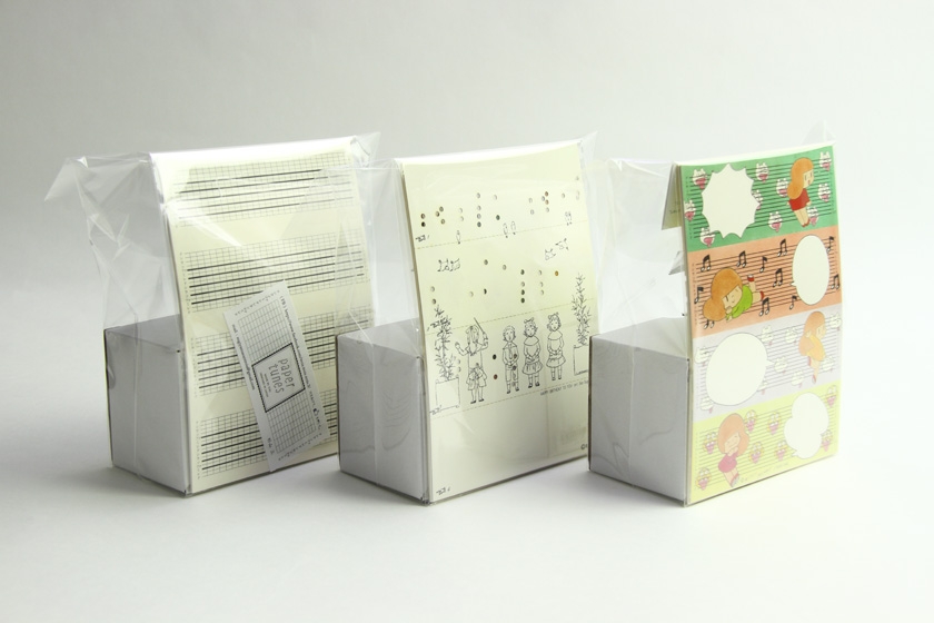 同时,自己也可以开孔制作旋律的事。制作方法就是用五线谱座席附属的开孔器在喜欢的文字和记号上开孔。将想要赠送给别人的话语和形状等,用与作曲稍微不同的方法能变成声音。